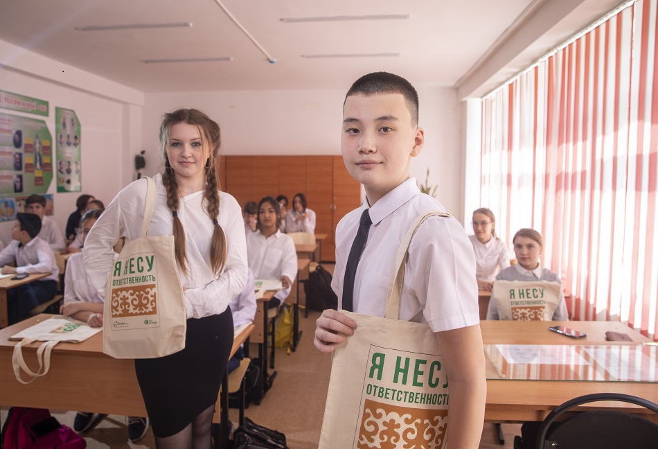 Акция прошла в Актобе, Хромтау и Аксу. Ученикам городских школ предложили собрать дома старые полиэтиленовые пакеты и пригласили на экологическую лекцию. Взамен пакетов ребятам раздали экологичные сумки-шопперы в национальном стиле со слоганом «Несу ответственность». Стоит отметить, что сумки были пошиты в актюбинском ателье, где работают многодетные женщины, матери-одиночки. Всего в ходе акции раздали 1000 экосумок.
